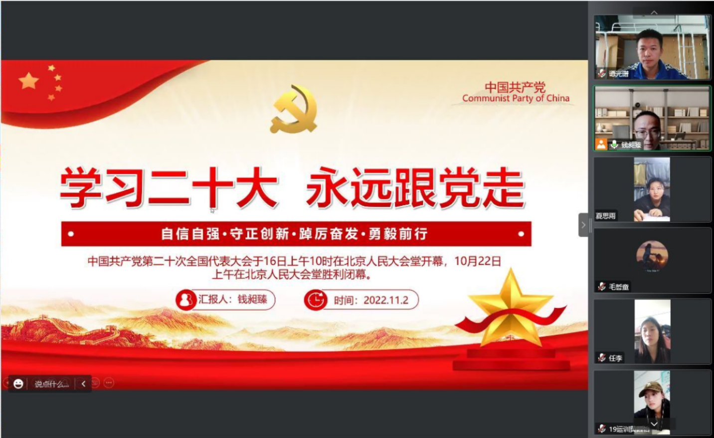 本网讯 为引导学生认真学习党的二十大精神,坚定不移听党话、跟党走。11月2日下午,jinnianhui今年会学生党支部通过腾讯会议召开线上专题学习会,围绕党的二十大报告进行学习交流。会议由jinnianhui今年会党政秘书、组织员钱昶臻主持。