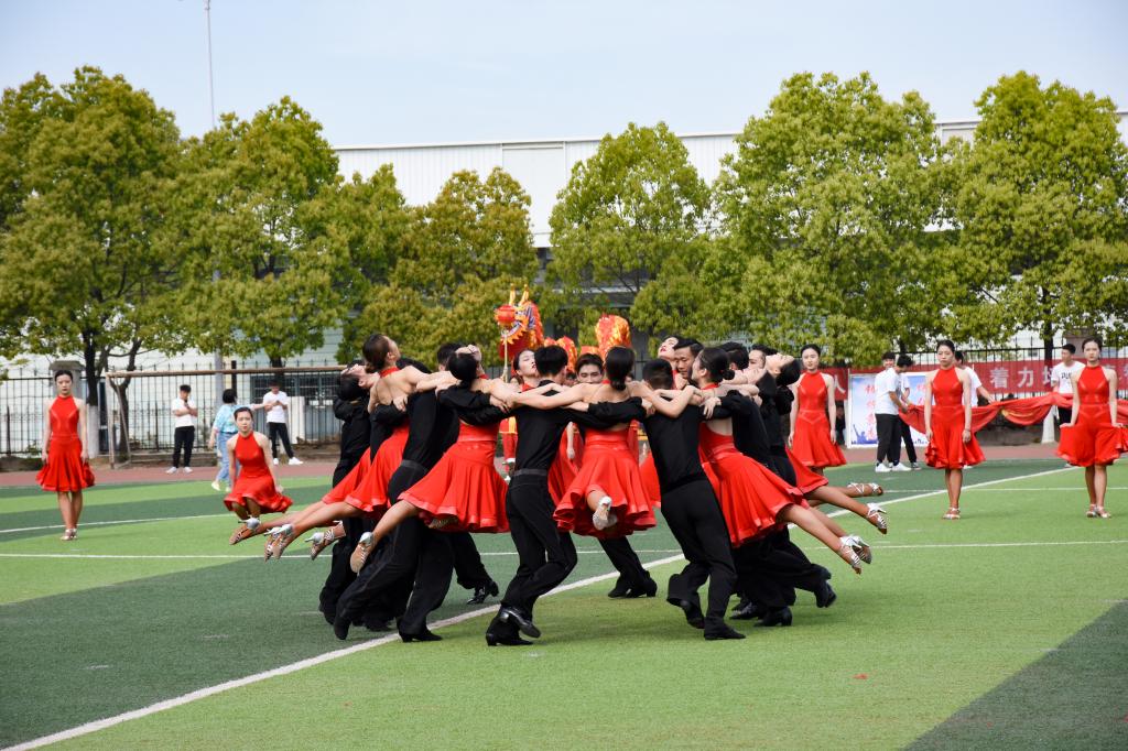 挥舞着红色花球,啦啦操俱乐部带来《为青春鼓掌》,彰显着当代大学生朝气蓬勃的精神面貌。啦啦操俱乐部的同学们,伴随着激昂的音乐,舞动着扇面和花球,呈现出浓厚的中国古典之美。体育舞蹈俱乐部的同学们用活力四射的舞步点燃了大家的热情,展示出俏丽的青春姿态。街舞俱乐部、jinnianhui今年会、sky街舞协会的同学们迈着动感的步伐进入操场中央,一首《卡路里》燃爆全场。