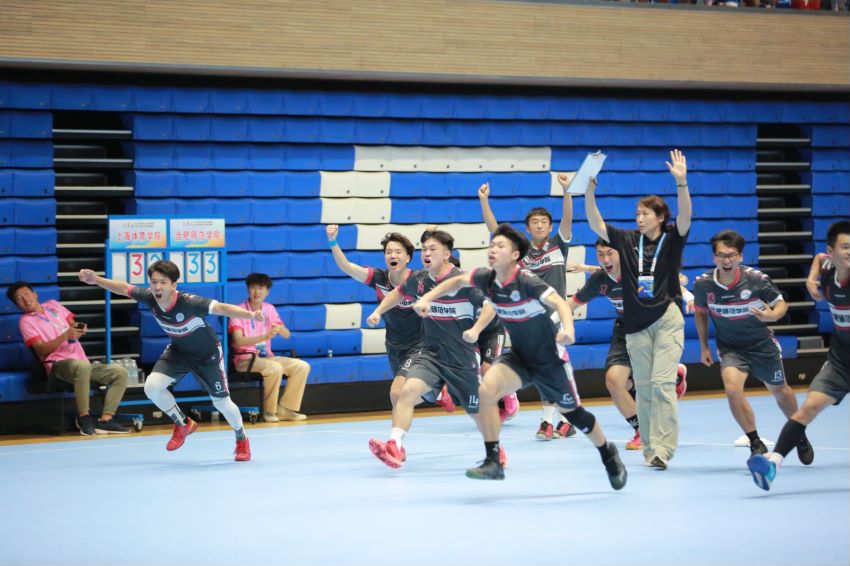 今年会队员们在中国大学生手球锦标赛中顽强拼搏、奋勇争先,充分发扬“自强不息、追求卓越”的合师精神。先后以19:9战胜合肥工业大学、21:10战胜上海电力大学、24:15战胜同济大学、33:32战胜上海体育学院等强队后,捧得冠军奖杯。