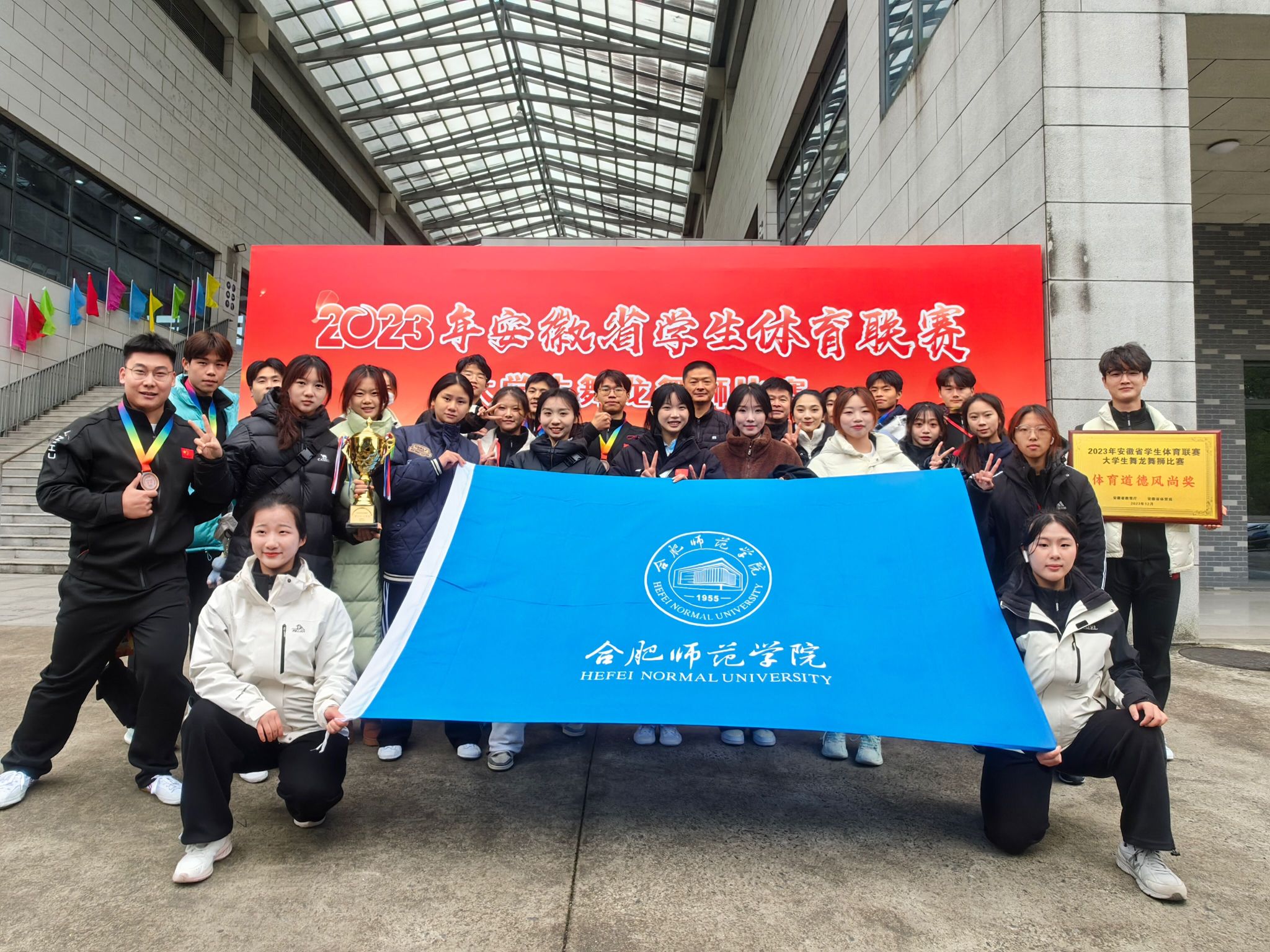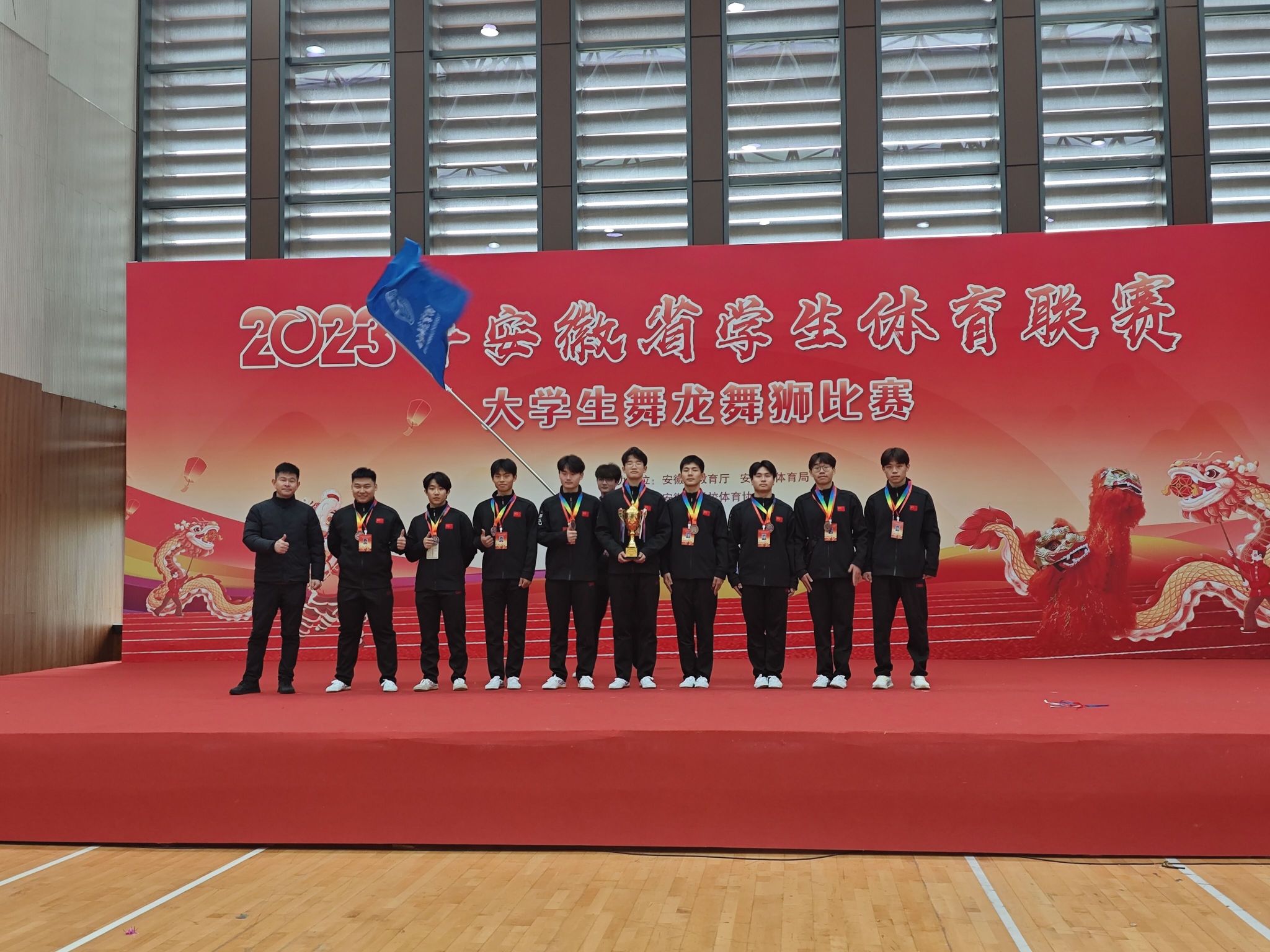 12月9日-12日,由安徽省教育厅、安徽省体育局主办,黄山学院承办的2023年安徽省学生体育联赛大学生舞龙舞狮比赛在黄山学院体育馆举行。今年会舞龙舞狮队共25名队员参加了女子丙组竞速龙、女子丙组舞龙规定套路和丙组彩带龙自选套路三个项目,比赛中,队员们团结协作、敢于拼搏,获得了女子丙组竞速龙第三名、女子丙组舞龙规定套路第四名和丙组彩带龙自选套路第三名的好成绩,同时获得“体育道德风尚奖”,倪莹、雷梓嫣获得体育道德风尚奖运动员。