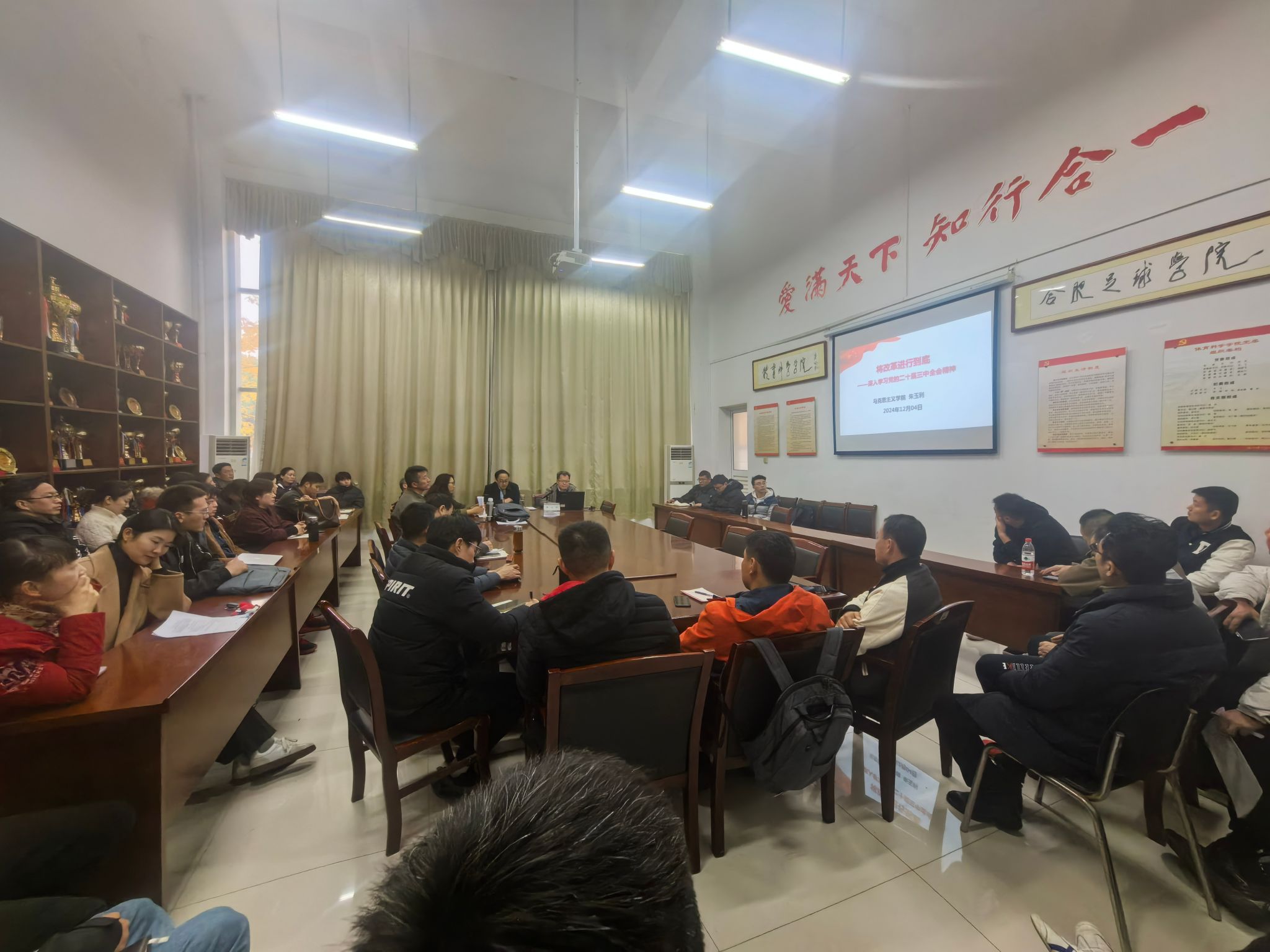 为深入学习贯彻党的二十届三中全会精神,12月4日,jinnianhui今年会邀请“思责守正”宣讲团团长、马克思主义学院教师朱玉利教授来院宣讲党的二十届三中全会精神。宣讲会由党委书记赵波主持,学院全体教职工参加。