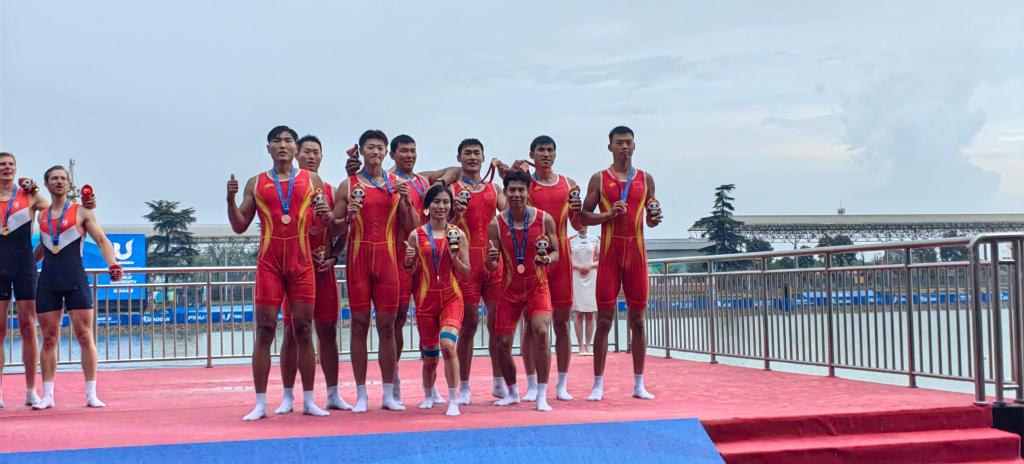 本网讯 近期,第31届世界大学生夏季运动会在成都举行。8月6日下午,在成都举行的第三十一届世界大学生夏季运动会赛艇项目中,学院2020级运动训练专业(现役运动员)学生苏雨恒与国家队队友团结拼搏以5分42秒27的成绩获得男子八人单桨有舵手决赛第三名,获得铜牌。继夏琦同学获得安徽首金后,胡凯同学获得两金一银,苏雨恒同学获得一铜,合师学子在本次大运会中取得了3金1银1铜1个第五名的历史最好成绩。
